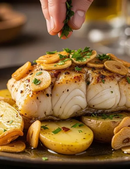 Rape al Horno con Patatas y Refrito de Ajo y Jerez