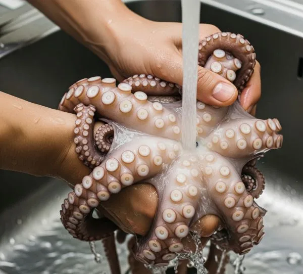 Si usas pulpo fresco, es muy recomendable congelarlo durante al menos 48 horas para romper sus fibras y que quede más tierno. Si ya lo compraste congelado, déjalo descongelar lentamente en la parte baja del frigorífico durante 24-36 horas. Una vez descongelado, lávalo bien bajo el agua fría.