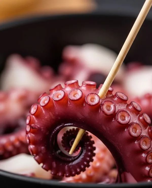 Tras el último "susto", introduce el pulpo completamente en la olla. Deja que cueza a fuego medio, manteniendo un hervor suave y constante. El tiempo de cocción es de aproximadamente 17-20 minutos por cada kilo de pulpo. Para un pulpo de 1.5 kg, serán unos 30-35 minutos. El mejor método para saber si está listo es pinchar la parte más gruesa de una pata con un palillo o un tenedor. Debe entrar con facilidad, sin resistencia. Una vez cocido, apaga el fuego y déjalo reposar en el agua caliente durante unos 10-15 minutos.