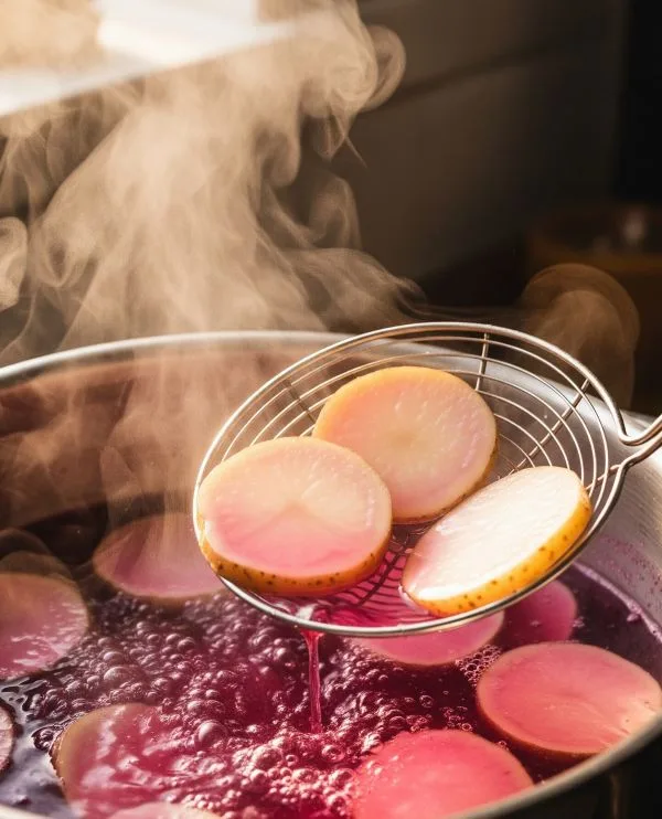Saca el pulpo del agua y resérvalo. En esa misma agua de cocción, rica en sabor, cuece las patatas peladas y cortadas en rodajas de aproximadamente 1 cm de grosor (los cachelos). Cuécelas durante unos 15-20 minutos, o hasta que estén tiernas pero sin que se deshagan. Escúrrelas.